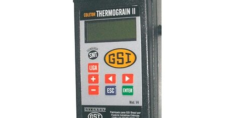 Leitor portátil para coleta de leituras individuais de cada silo e controle centralizado, com monitoramento da temperatura dos grãos no interior do silo.